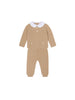 La Coqueta creates pieces like the Fonzo Merino Baby Knitted Set with your newborn's well-being in mind, opting for pure Merino knits with a fine gauge that has the softest handle and is kind to even the most delicate skin. Our charming sets are proudly made in Spain at family-owned ateliers, handcrafted with the utmost care and attention to detail. This unisex camel two-piece set is perfect for those early months with your little one, offering total comfort all day long. The sweater has dropped shoulders and long sleeves, with intricate garter stitching along the yoke, mother of pearl button details, and a statement Peter Pan collar in crisp cotton and a button placket to fasten at the back. Finished with chunky ribbed trims, it has matching footless leggings for extra comfort.