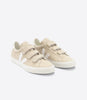 Beige suede sneaker with foil metallic details and white soles.